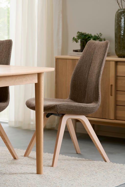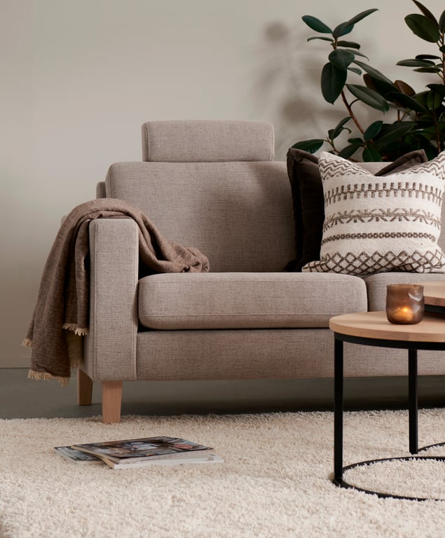 Brunstad Choice Høy hjørnesofaModulsofa. 3,25 seter duo + 90° hjørne + 2,5 seter, arm 001. Stoff Saga Liver, hvitpigmenterte ben