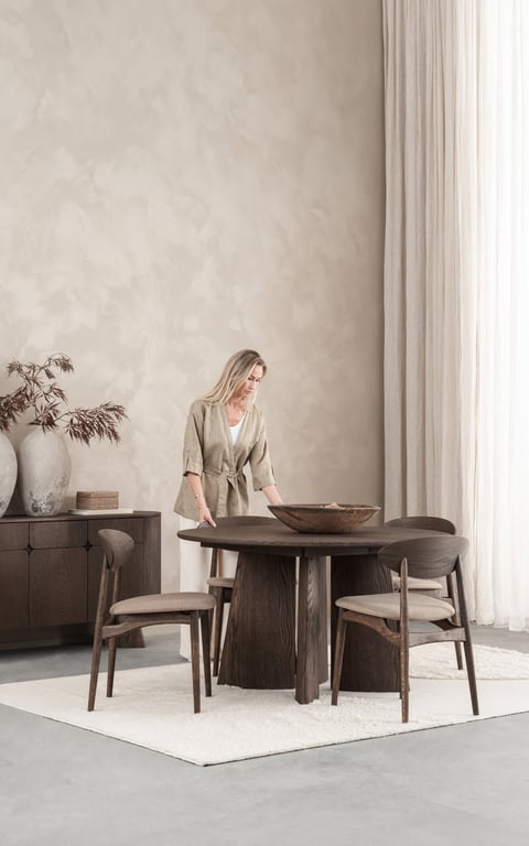 Japandi spisebord kombinerer japansk varme med skandinavisk enkelhet, og blir et naturlig midtpunkt i romet. Bordets runde form skaper en lun og sosial ramme rundt måltidet, mens de gjennomførte materialene og de solide bena gir et moderne og tidløst uttrykk.