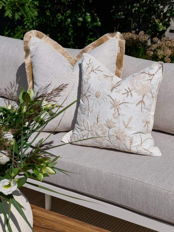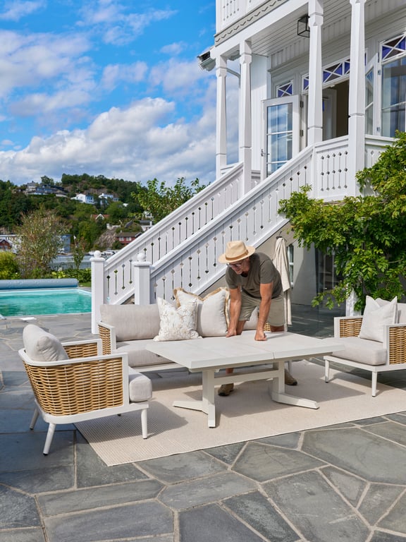 Randers hagegruppe3 seter + 2 sofastoler og bord. Woodlook med ecrufargede puter.