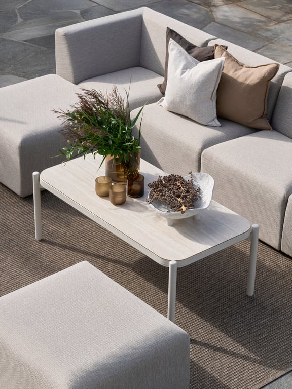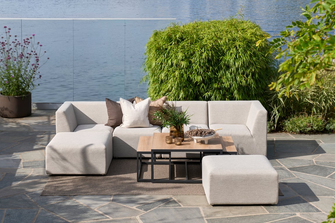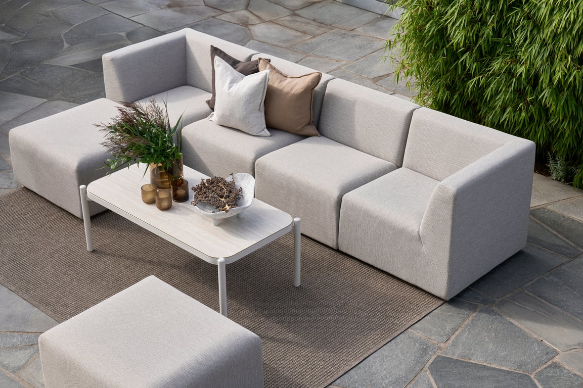 Moderne utemøbel i moduldesign – trukket i slitesterkt Sunproof®-stoff med drenerende skum som tørker raskt. Fleksibel komfort og skandinavisk stil, laget for å være ute hele sesongen.