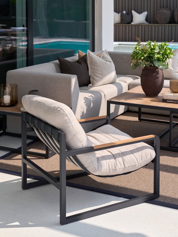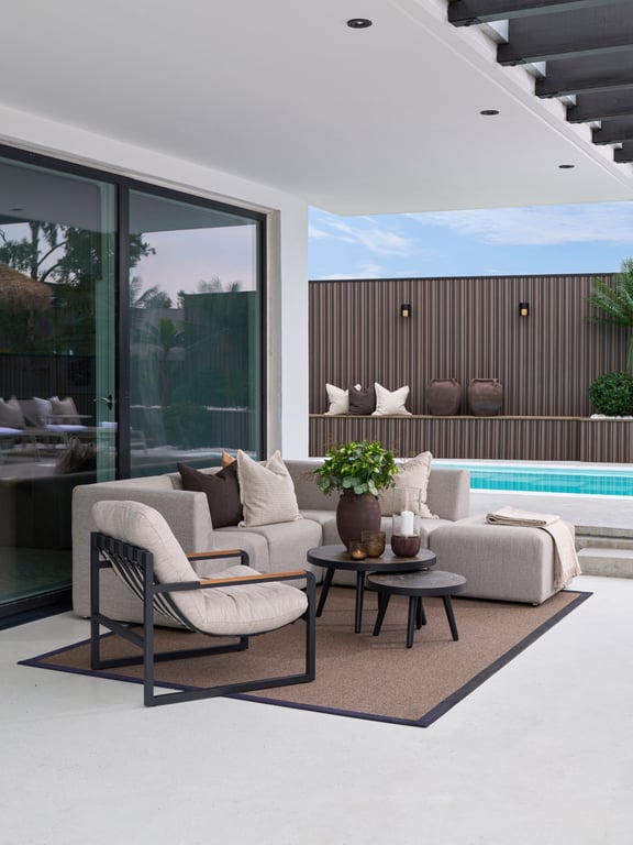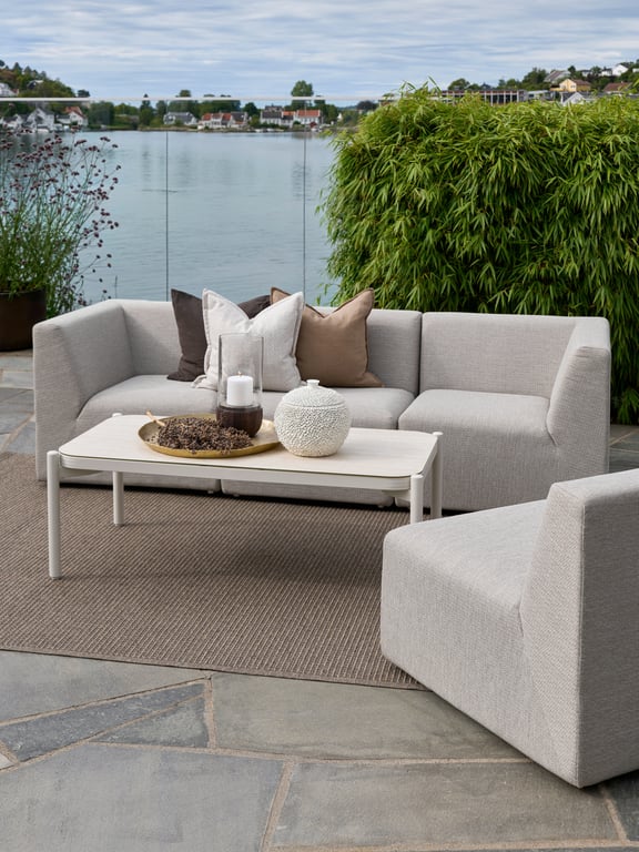 Moderne utemøbel i moduldesign – trukket i slitesterkt Sunproof®-stoff med drenerende skum som tørker raskt. Fleksibel komfort og skandinavisk stil, laget for å være ute hele sesongen.