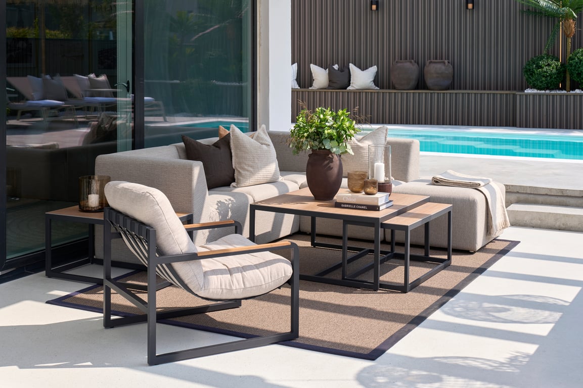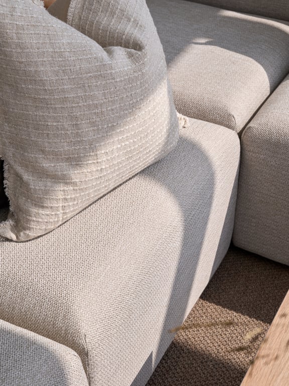 Moderne utemøbel i moduldesign - trukket i slitesterkt Sunproof®-stoff med drenerende skum som tørker raskt. Fleksibel komfort og skandinavisk stil, laget for å være ute hele sesongen.