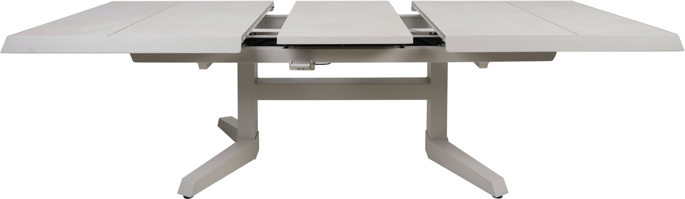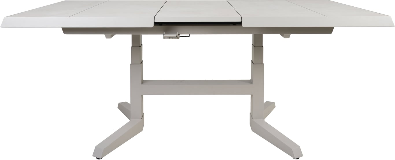 Et av våre mest fleksible hagebord! Judson kan justeres både i lengden og høyden, og kan dermed brukes både som spisebord og sofabord. Uttrekksfunksjonen gir 2 ekstra sitteplasser ved behov. Bordet har trinnløs regulering fra 51-75cm høyde. Høydejusteringen gir deg en mer praktisk høyde ved bespisning, og gir deg en kombinert sofa/spisegruppe. Bordet kan også trekkes ut fra 143 til 183 cm lengde. Dra de to endene fra hverandre og illeggsplaten vil automatisk komme frem. Ved full høyde og full bredde fungerer bordet også som et fullfunksjonelt spisebord med 2-3 stoler på hver langside.