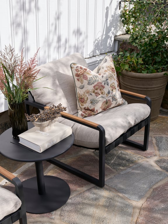 Marielle spisestolSvart m/beige rope, teakdetaljer og vaniljefarget pute