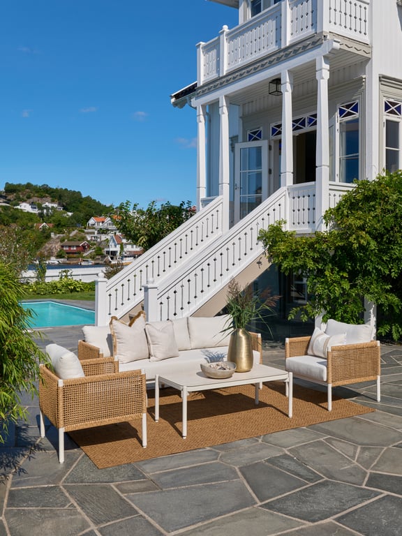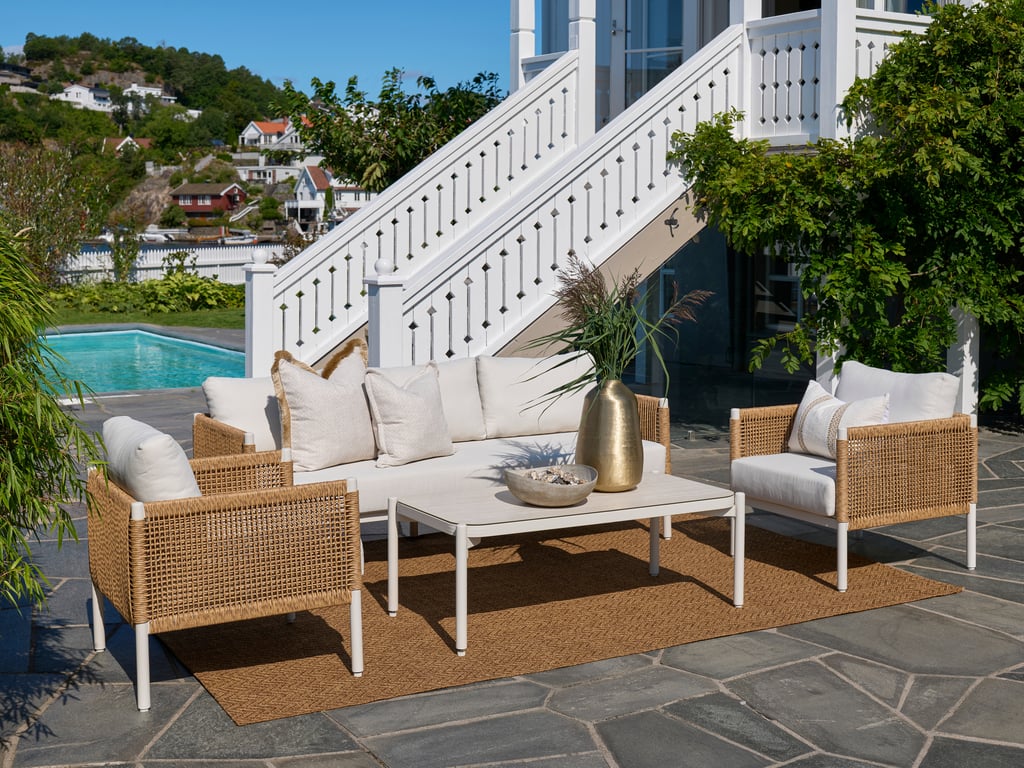 Stolen har slitesterke Olefin puter og en ramme i pulverlakkert aluminium, som sikrer både komfort og langvarig bruk. Olefin er et materiale som er svært UV-bestandig og hurtigtørkende. Vi anbefaler likevel at putene tas inn når det regner. Kunstrotting er et materiale som er beregnet for utendørs bruk og tåler vær og vind og trekker ikke til seg fuktighet.