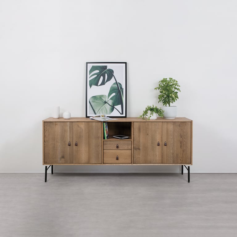 Denne skjenken er laget av heltre eik i hvitoljet utførelse, med vakre fingerskjøtte hjørner som gir et elegant preg. Dørene og skuffene har softclose-mekanisme, slik at de lukkes mykt og stille.
