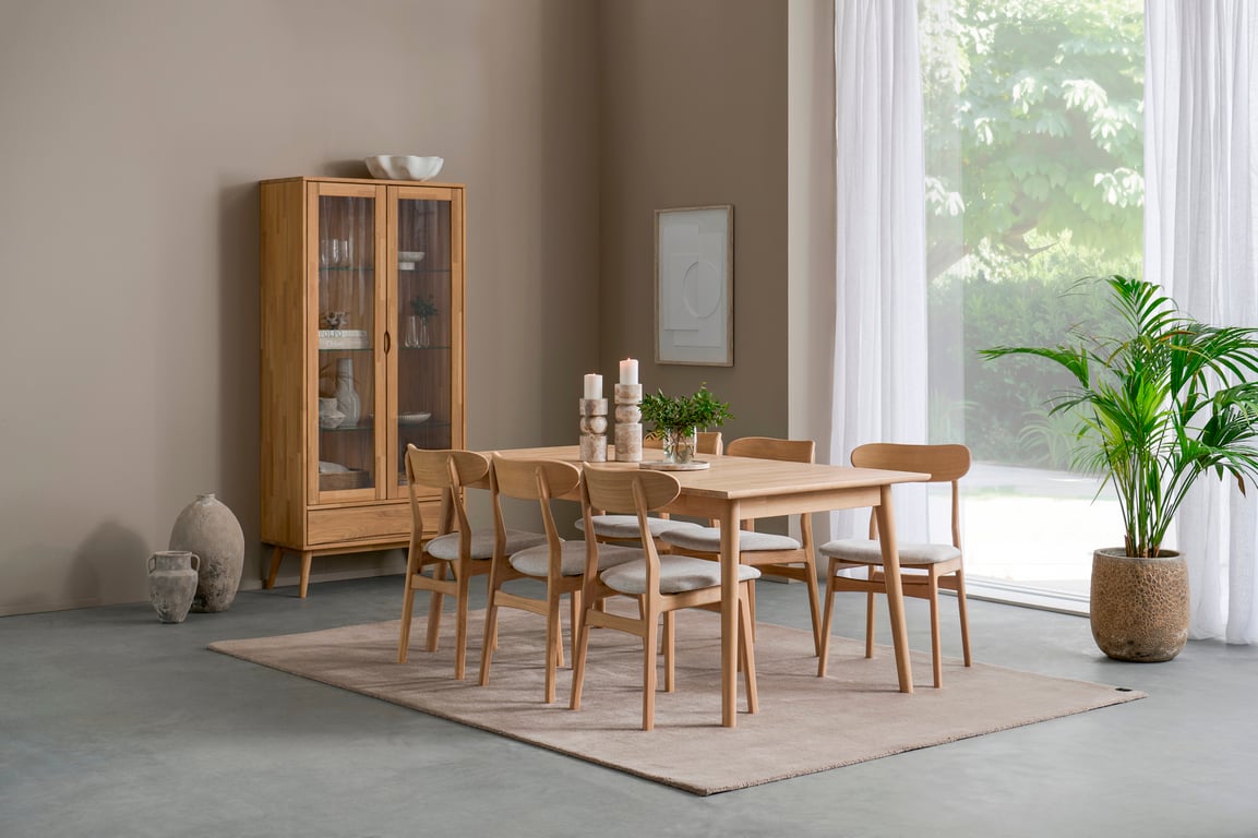 Fyn spisestol har sete i svart lær og ben i enten eik/hvitoljet, smoked olje eller svartbeiset. Med disse valgene kan du finne en Fyn-stol som passer perfekt til resten av spisestuen din.