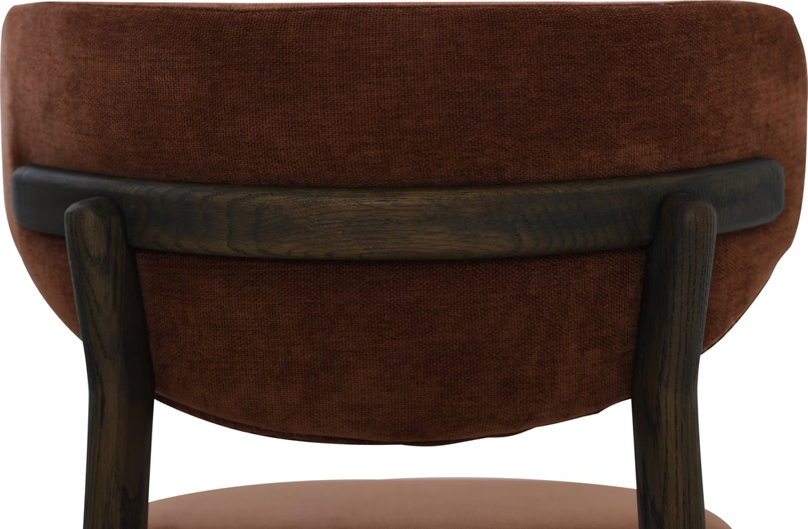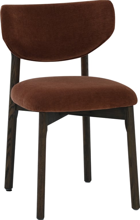 Elegant spisestol i burgunder tekstil med brunlakkert eikeunderstell. Tilfører rommet dybde og farge – perfekt som statement-stol eller som del av et dristigere interiør. Finnes i flere farger.