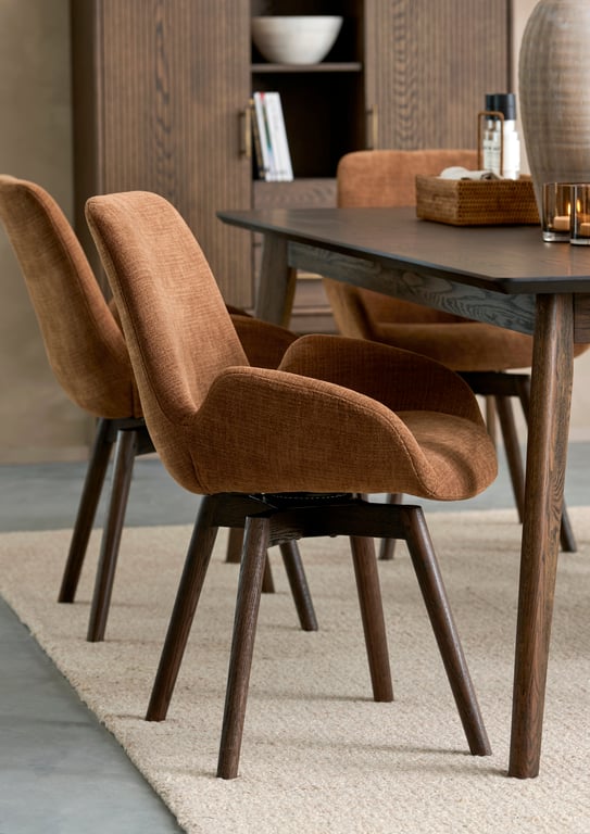 Moderne spisestol med avrundede linjer, taupe tekstil og hvitpigmentert eikeunderstell. Gir en balansert og stilfull finish til spiseplassen.