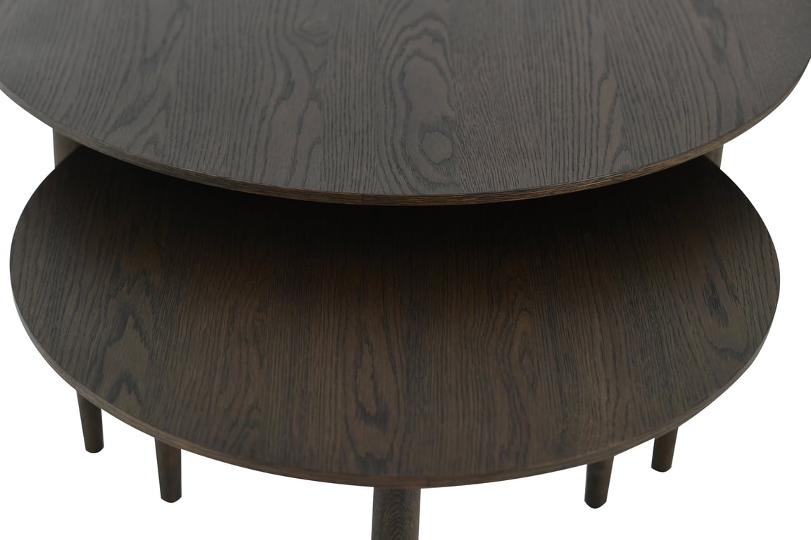 Karmøy rundt sofabord med hylle kombinerer funksjon og estetikk i et tidløst design. Den runde formen gir et mykt og innbydende uttrykk, mens den praktiske hyllen gir ekstra plass til oppbevaring. Med bordplate i eikefiner og ben i heltre eik er bordet er solid og stilrent valg for deg som ønsker et moderne uttrykk i stuen. Sofabordet kommer i to utførelser: hvit og brun eikefiner, og er en del av Karmøy-serien vår.