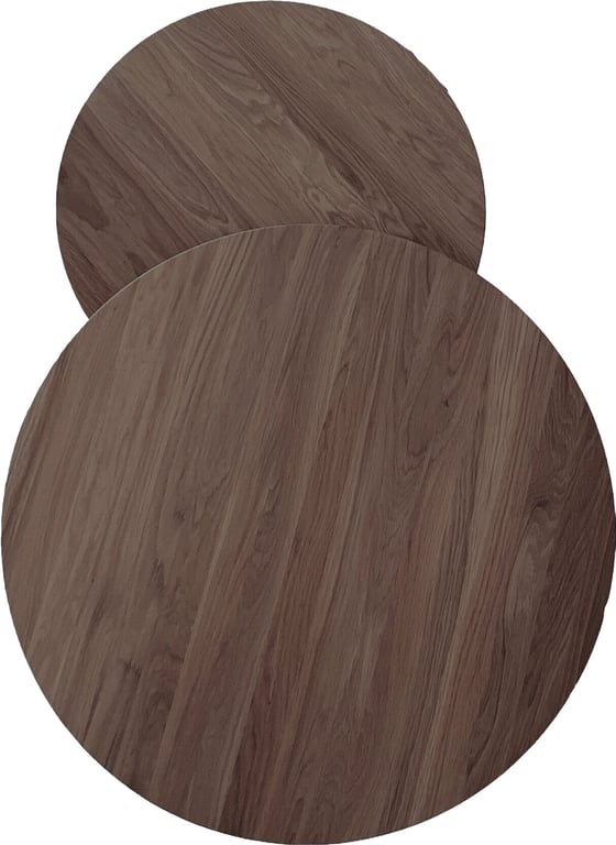 Karmøy rundt sofabordsett består av to elegante bord i ulik høyde og størrelse. Det mindre bordet kan skyves delvis inn under det større, noe som gir fleksibilitet og et ryddig uttrykk.