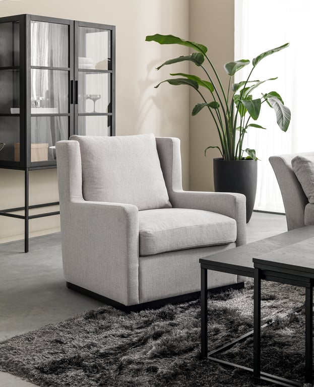 Charlotte lenestol har et eksklusivt utseende med vangene som går i ett med ryggen i en elegant bue. Seteputene har duntopping for ekstra god sittekomfort og er vendbare. Ryggputene har silikonputer som standard, men kan også bestilles med en blanding av kaldskum, silikon og dun mot et pristillegg. Velg mellom flere farger, tekstiler og benalternativer.